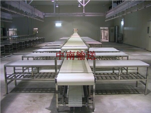 分割輸送機(jī)又稱不銹鋼尼龍輸送線,是分割肉流水線生產(chǎn)的主要設(shè)備之一。適用于牲畜胴體劈半、預(yù)冷、排酸后的剔骨、分割,該機(jī)的機(jī)架體全部采用不銹鋼材料。輸送帶為無(wú)毒尼龍輸送帶,為使經(jīng)久耐用,采用了無(wú)接頭的特制方式,使該機(jī)在使用中達(dá)到了無(wú)噪音,輸送帶無(wú)偏斜現(xiàn)象發(fā)生,機(jī)腳座采用尼龍活動(dòng)腳,安裝調(diào)式輸簡(jiǎn)便,機(jī)架選料為無(wú)縫不銹鋼方管,解決發(fā)積垢污染問(wèn)題。使設(shè)備的衛(wèi)生條件達(dá)到了分割車間對(duì)外注冊(cè)的標(biāo)準(zhǔn),并使剔骨、分割肉生產(chǎn)輸送自動(dòng)化。