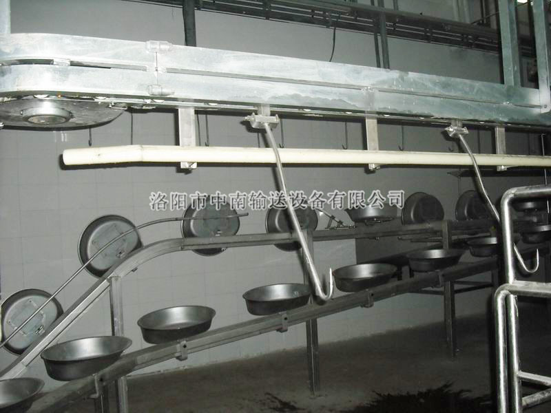 同步衛(wèi)檢線可分為:落地式和懸掛式。將屠體的頭、腸、胃、心、肝與胴體同步對好檢驗,紅臟與白臟懸掛在衛(wèi)檢線上,按設(shè)定的速度與胴體加工線同步運行,由人工對內(nèi)臟進行充分檢驗檢疫,,這樣既保證了肉質(zhì)的衛(wèi)生質(zhì)量,又符合國家有關(guān)衛(wèi)生檢測標準。該設(shè)備運行平穩(wěn),同步準確,是屠宰加工中不可缺少的裝置之一。